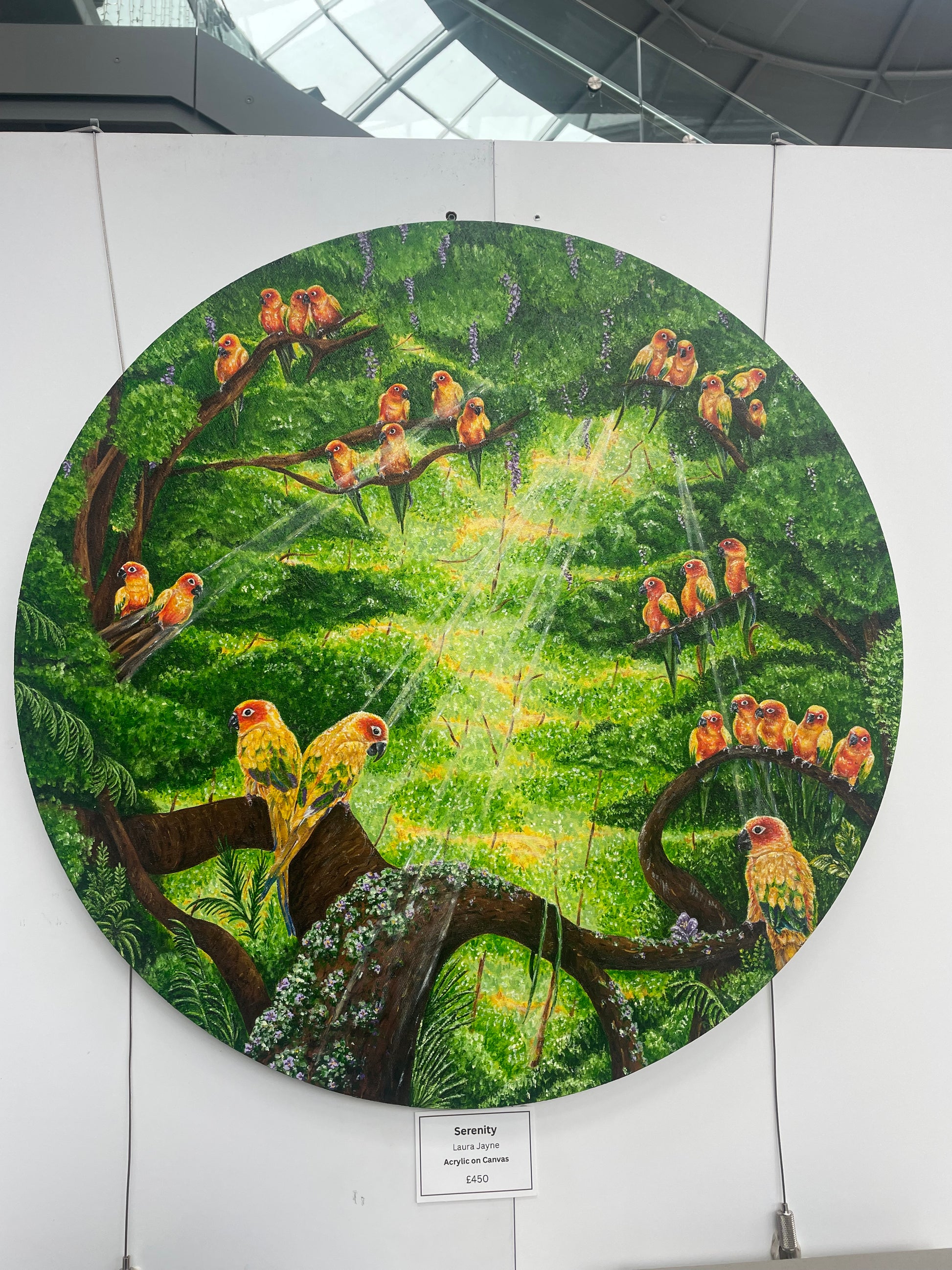 Created to share the vibrancy and life of a rainforest, this painting uses acrylics to highlight the sun conures whilst sun beams represent the light shining through the trees 🌳