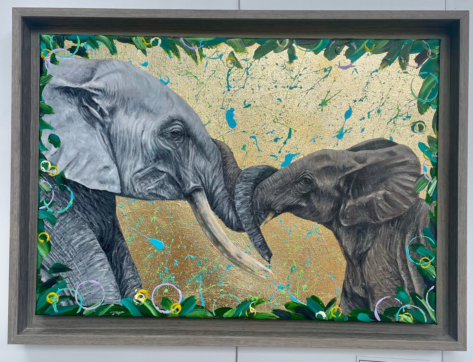 “Unforgettable” is a mixed media painting that tries to capture the familial characteristics of elephants, highlighting their ability to never forget one another